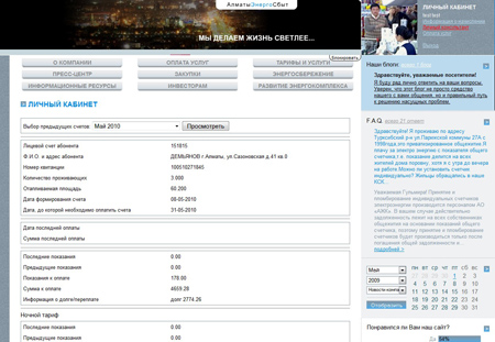 Особое внимание при разработке сайта было уделено функции «Личный кабинет». Каждый потребитель, имеющий доступ в Интернет, зарегистрировавшись в «Личном кабинете» сможет оперативно получать индивидуальную информацию о состоянии своего лицевого счета, накапливая историю своих платежей с момента регистрации, а также возможность оплатить за электроэнергию посредством Интернета. Процесс оплаты в Личном кабинете будет происходить через систему е-pay ККВ банка, позволяющую производить оплату за потребленную электроэнергию с платежной карты любого банка. Основное отличие Личного кабинета ТОО «АлматыЭнергоСбыт» заключается в том, что помимо оплаты как таковой, потребитель сможет получить самую полную информацию о своем лицевом счете, более широкую, чем она представлена в обычной квитанции. Иными словами, потребитель сможет увидеть сумму, начисленную к оплате, снятые показания и их дату, потребление в пределах и сверх лимита, действующий тариф, историю платежей (оплаты и снятых показаний), а также проверить расчеты с помощью электронного калькулятора. Кроме того, пользователь может задать вопрос Личному консультанту и получить индивидуальную консультацию по своему лицевому счету. При этом, что немаловажно, за Интернет платежи и услуги «Личного кабинета» не будет удерживаться никакая, в том числе и банковская комиссия.